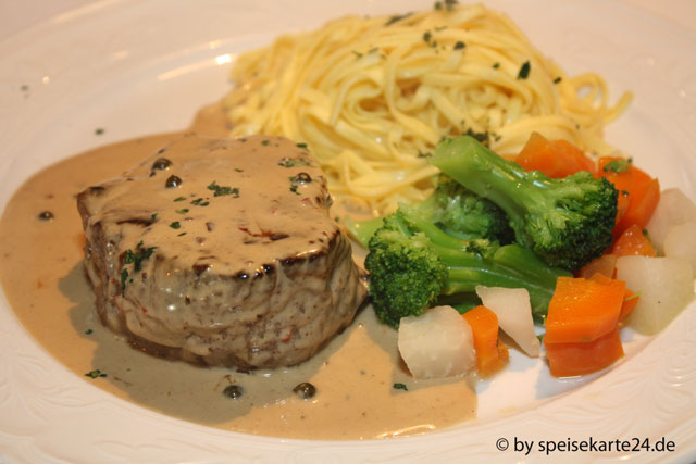 Rinderfilet (aus Colorado) mit Pfeffersaucemit Pommes frites und Tagesgemüse