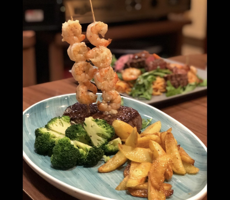 "Surf & Turf''Ein Klassiker aus den USA - Gegrilltes Rumpsteak mit Garnelen, Gemüse und Steakhouse-Pommes