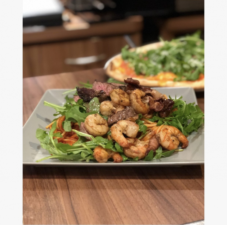 Spaghetti Surf & Turf mit Salatmit Garnelen, Steakstreifen, Speckwürfeln, Knoblauch, Tomatensoße, Rucola - scharf!