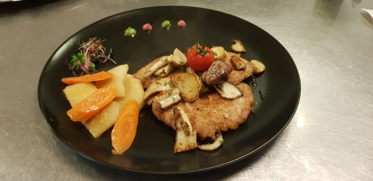 RahmschnitzelPaniert mit frischen Champignons und Rahmsoße, dazu frisches Gemüse, Pommes frites & ein Vorspeisen Salat