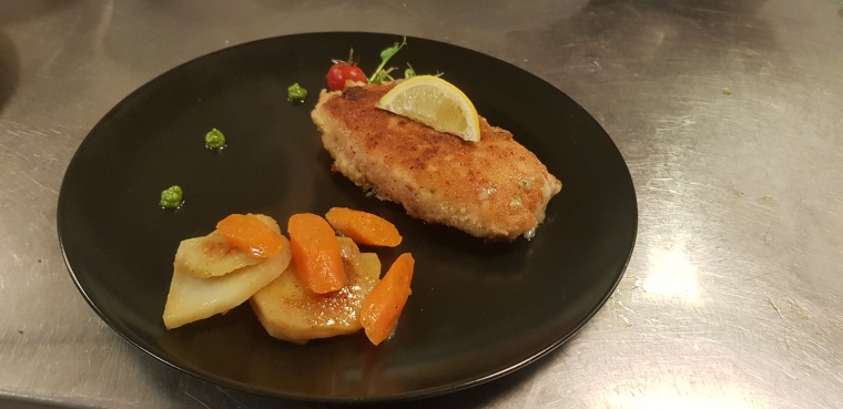 Cordon Bleu mediterranegefüllt mit Parmaschinken, Rucolapesto & Büffelmozzarella, dazu frisches Gemüse, Bratkartoffeln & ein Vorspeisen Salat