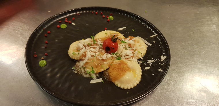 Hausgemachte Nudeln gefüllt Rahmspinatan fruchtiger, Tomatencremesoße, gratiniert mit Käse (mit Knoblauch)