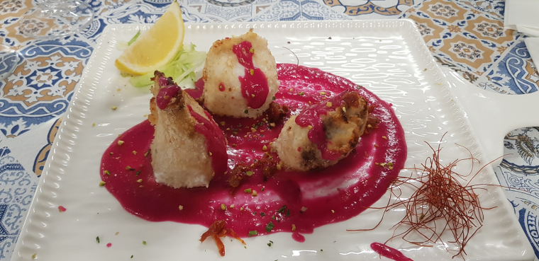 Schafskäse in Rotweinsoßeim Ofen gebacken, mit Knoblauch