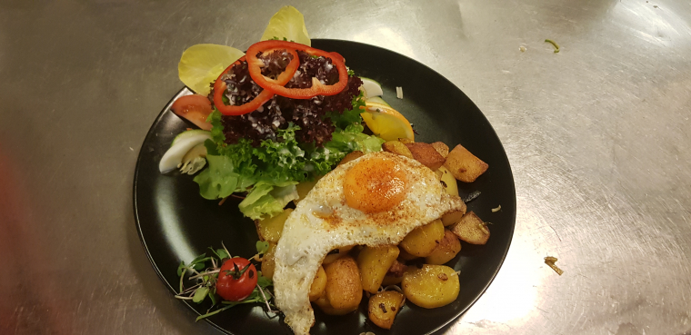 BauernsalatBunter gemischter Salat mit Bratkartoffeln, Speck, Zwiebeln und Spiegelei