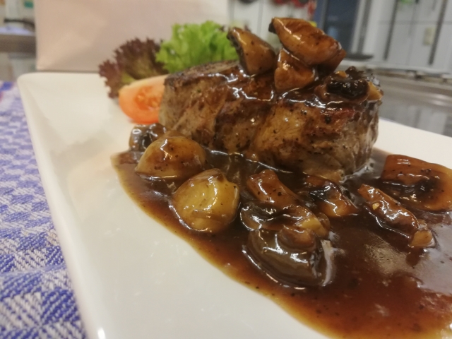 Braumeister SteakRoastbeef-Steak, gegrillt, serviert an einer herben Biersoße mit Champignons, die dem Steak einen rustikalen Geschmack verleiht. Dazu Bratkartoffeln und Salat. (L)