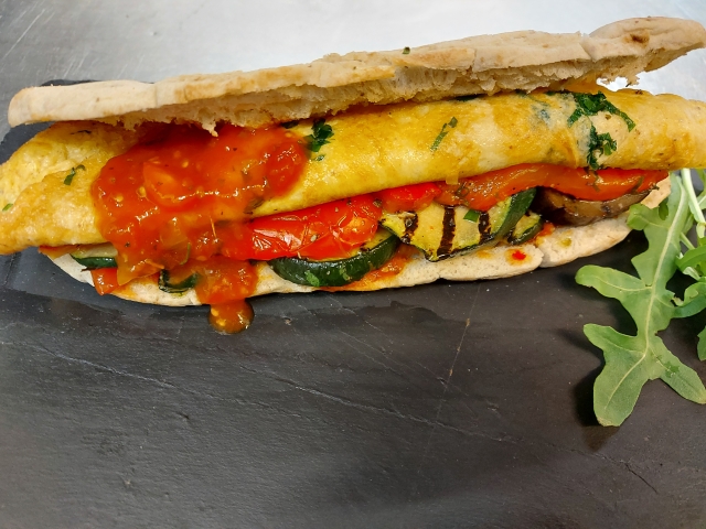 Pinsa vegetarischMozzarella, Kürbis, gegrilltes Gemüse (Zucchini, Auberginen, Paprika)