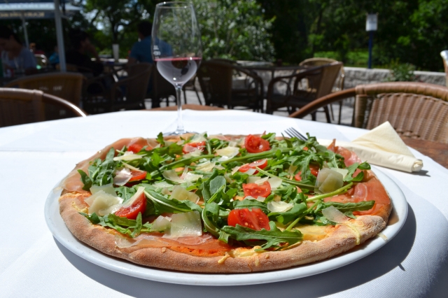 Pizza Parma e Rucolamit Parmaschinken, Rucola, Tomatenscheiben und Parmesan