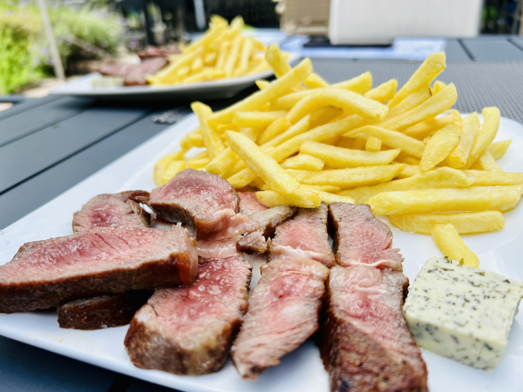 Rumpsteak mit Kräuterbuttermit Salat und wahlweise Pommes oder Pasta Aglio Olio