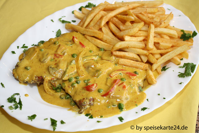 mit panierten Schweinefleischstücken, Zwiebeln, Gurken, Tomaten, Paprika und Ei