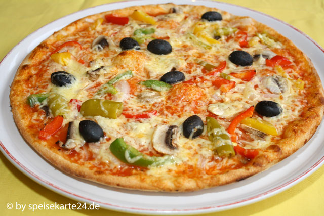 mit Schinken*, Champignons, Paprika, Artischocken und Knoblauch